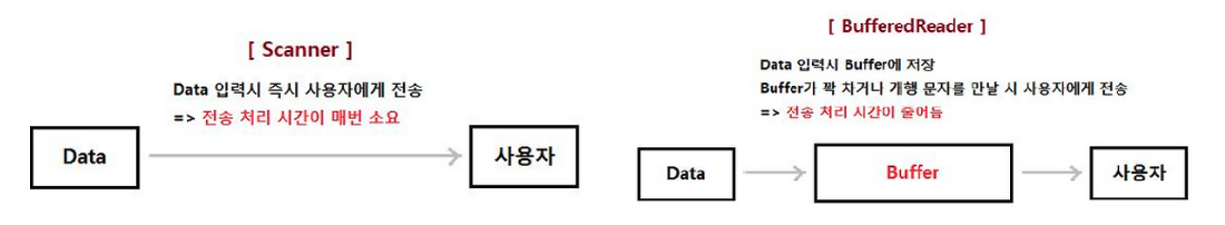 위 그림에서 알 수 있듯이, Scanner는 데이터를 읽을 때마다 시스템에 직접 요청하는 반면, BufferedReader는 버퍼에 데이터를 한 번에 불러온 후 버퍼에서 읽어오는 방식으로 작동합니다.