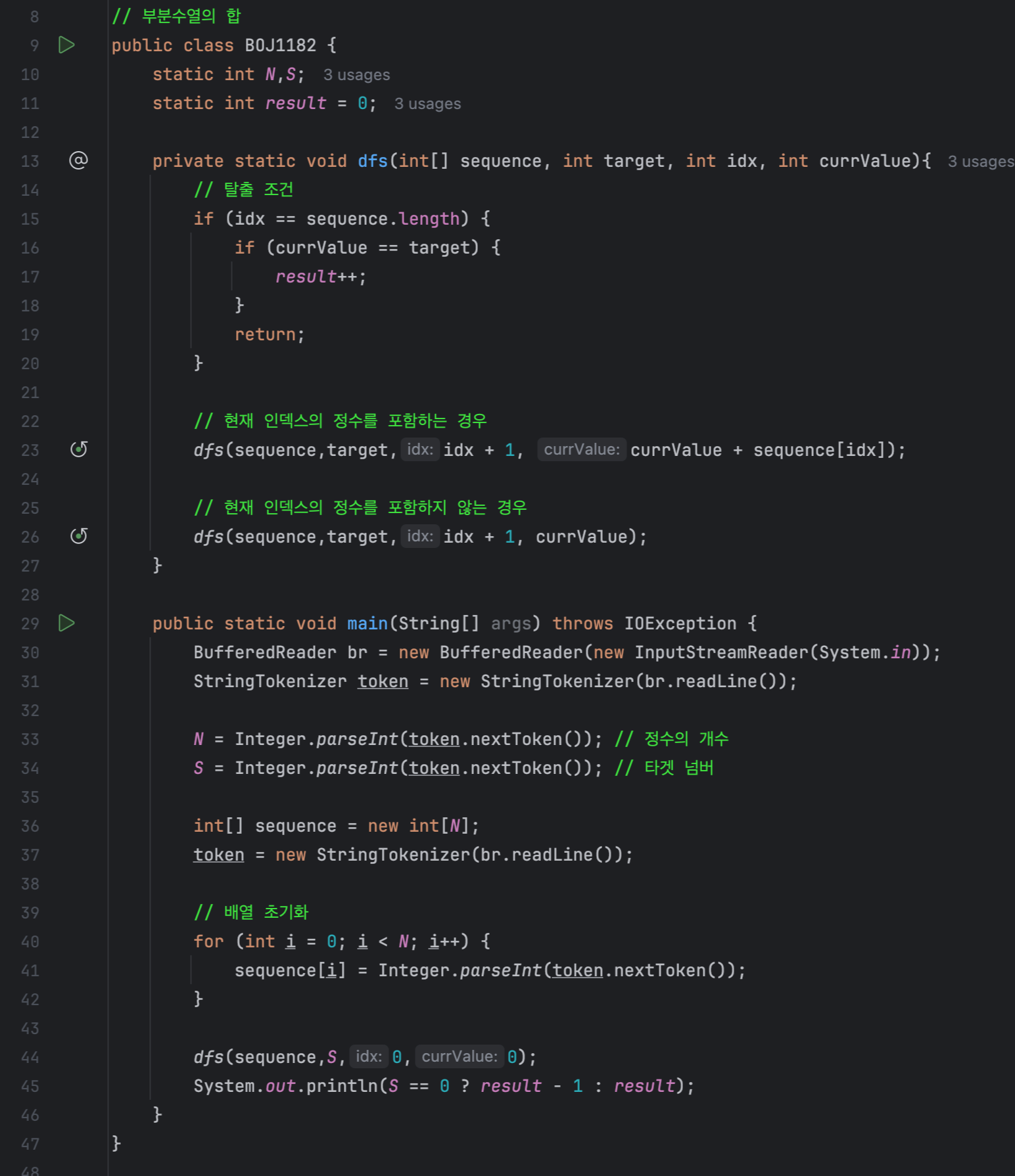 재귀 함수에서 중요한 부분 중 하나인 탈출 조건은 idx(인덱스)가 수열의 길이와 같을 때, 즉, 수열을 전부 순회했을 때 입니다. 이때, 수열을 모두 탐색한 후, 현재까지 더한 값이 타겟 넘버(S)와 같다면 경우의 수를 증가시킵니다.