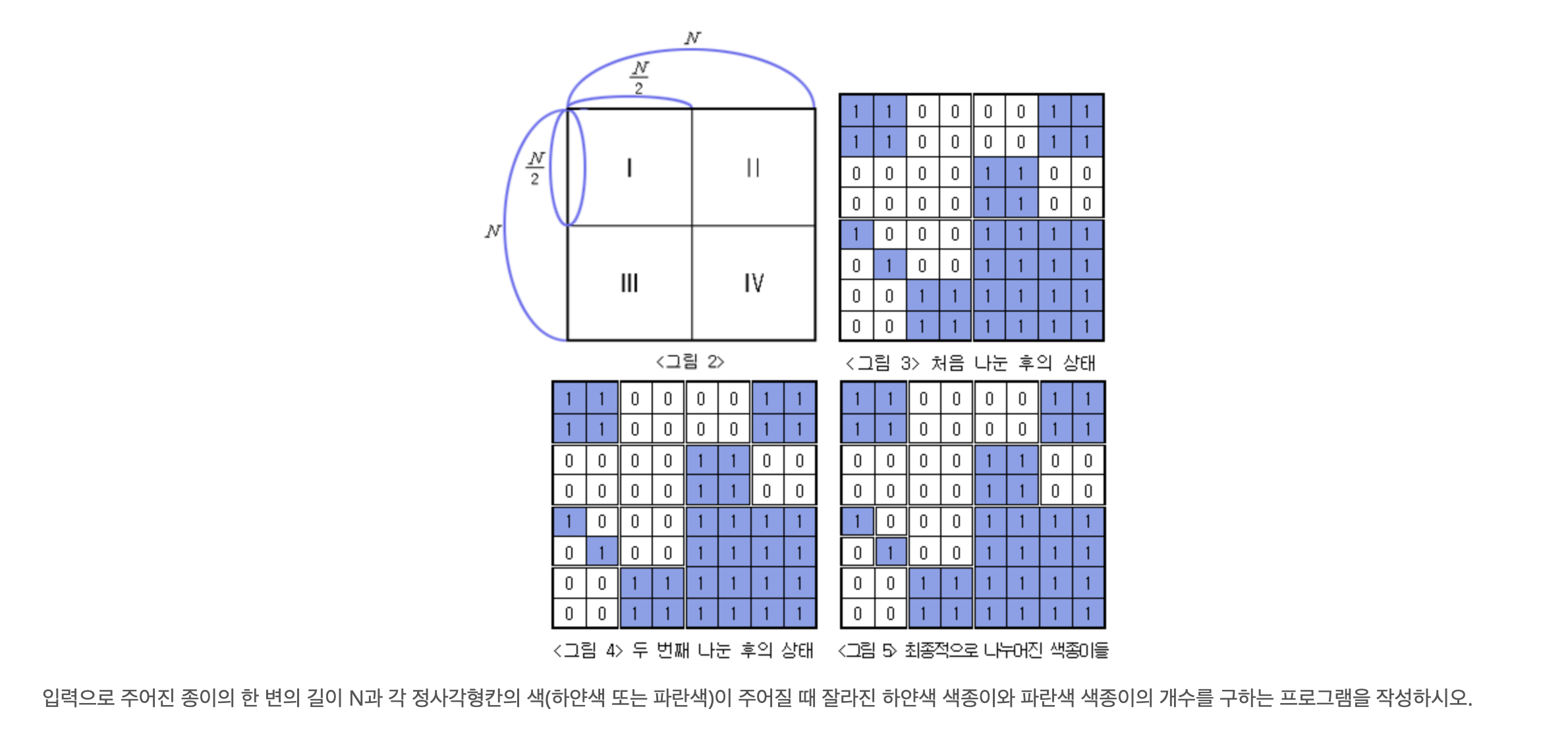"백준 - 색종이 만들기" 문제는 하얀색(0)과 파란색(1)로 칠해진 종이가 주어지고 전체 종이가 모두 같은색으로 칠해있지 않으면 N/2로 나눠가면서 모든 영역의 종이가 같은색으로만 이루도록 만들고, 각 종이의 색깔의 개수를 출력하는 문제입니다.