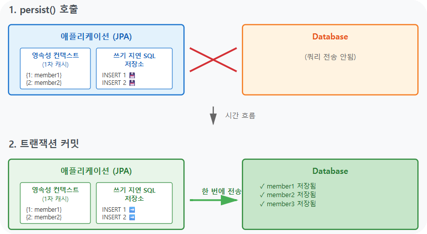 JPA는 기본적으로 트랜잭션의 커밋 시점에 쿼리를 모아서 한 번에 보냅니다. 이를 "쓰기 지연"이라고 부릅니다.