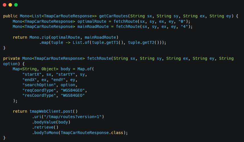 사용자에게 "최적 경로"와 "안전한 대로 우선 경로"를 모두 제공하여 선택권을 주려는 프로젝트의 핵심 기능이 구현 불가능한 상황이었고, 이를 Spring WebFlux의 Mono.zip을 활용한 병렬 요청 처리로 해결했습니다.
