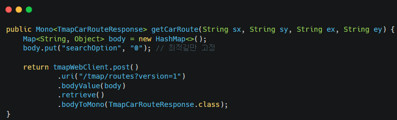 - 단일 경로가 아닌 다중경로 최적 경로(searchOption=0)와 대로 우선 경로(searchOption=4) 요청을 동시에 생성