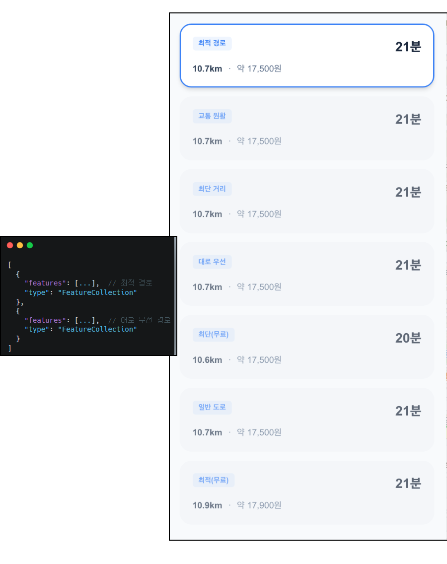 위 예시에서는 2개의 경로 옵션(최적, 대로 우선)였지만, 실제 프로젝트에서는 사용자에게 더 다양한 선택지를 제공하기 위해 7개의 경로 옵션을 동시에 조회하도록 확장했습니다.