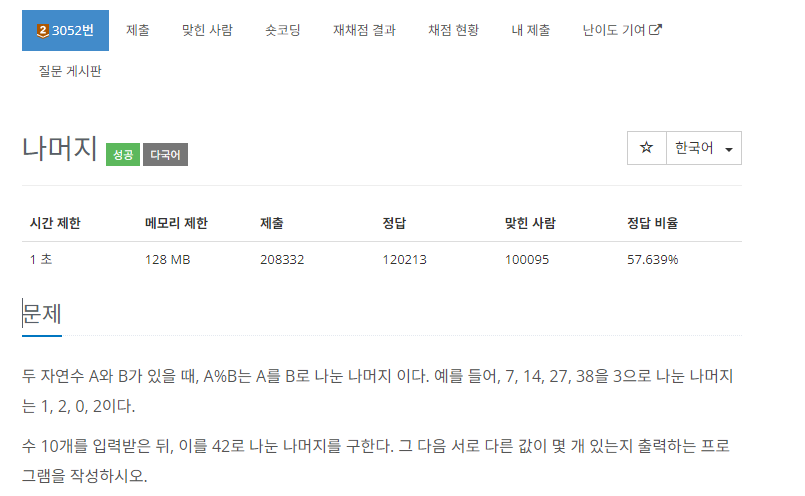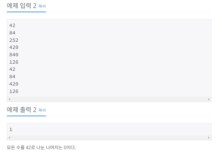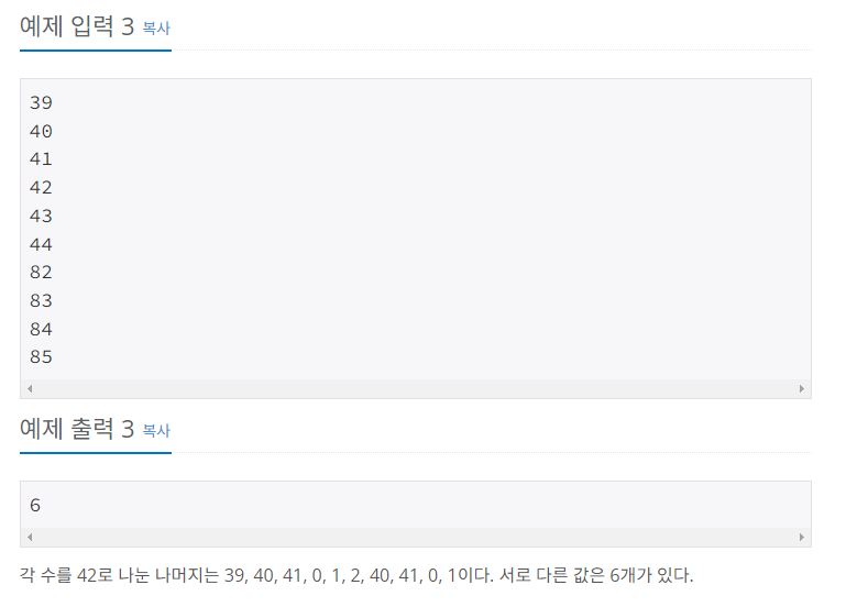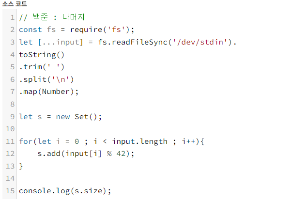 입력받은 수의 길이만큼 반복하는 기본 for문을 사용했고, Set 자료형으로 선언한 s에 요소를 추가하는 메서드인 add()를 사용하여 42로 나눈 나머지를 추가했습니다.