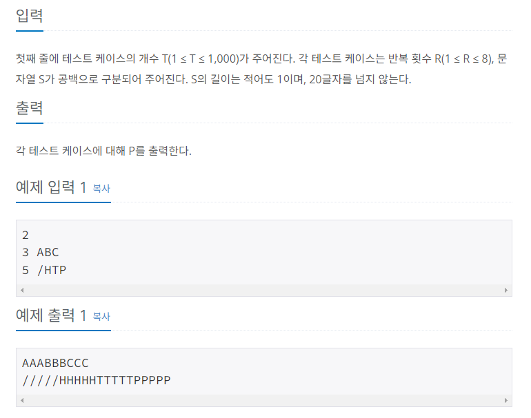 그리고 테스트 케이스의 개수 T만큼 반복하는 기본 for문을 사용해 줍니다. 반복 횟수 R과 문자열 S를 구조 분해 할당을 사용해서 받아주었습니다.